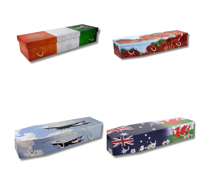 Cardboard coffins have gained popularity in the UK for their cost-effectiveness and eco-friendly nature. Despite their simplicity, they provide a dignified option for those looking for a budget-friendly choice. It is important to note that there may be weight limitations when choosing a cardboard coffin, make sure to consider the person’s size first. Always aim to choose a cardboard coffin from a well-known provider to make sure you receive the best service and quality. Cardboard coffins can decompose quicker than traditional wooden coffins. They may break down within a few months to a couple of years, depending on conditions. These are also much more ECO friendly when cremation is your chosen option. There are some very clever wood effect finishes that follow the more tradional route and some very unique ones as shown below.